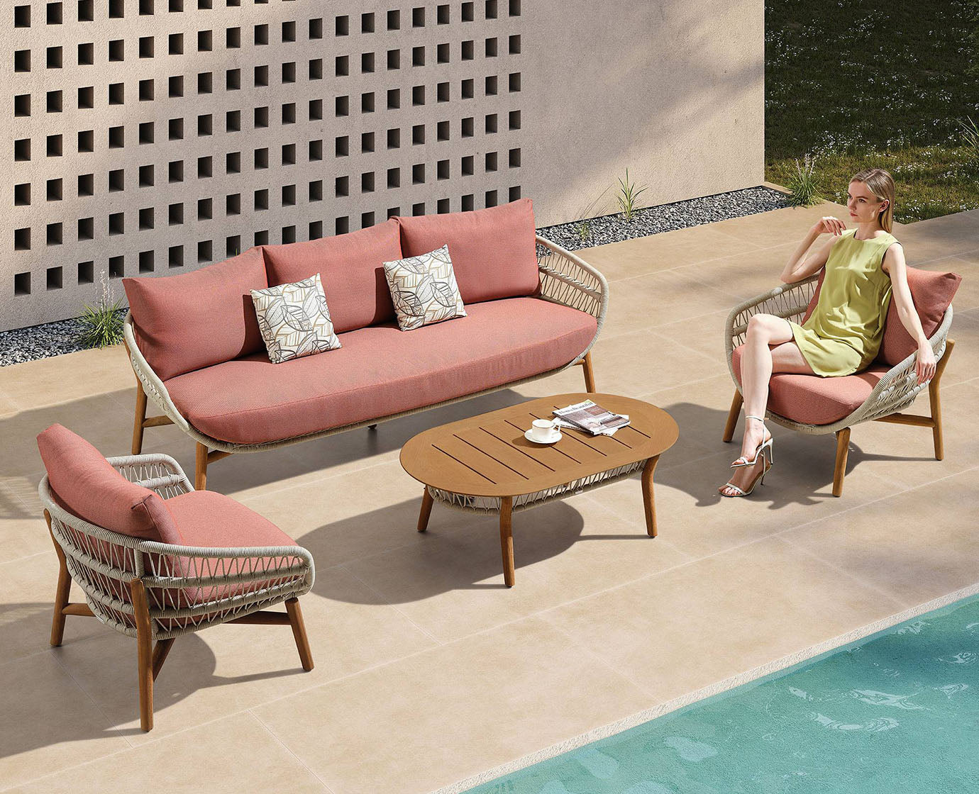 the sensation of light-heartedness, well-being and levity, perfect mix at the end of a demanding day. Its rounded shapes and soft cushions convey a harmony and sense of calm. The wooden